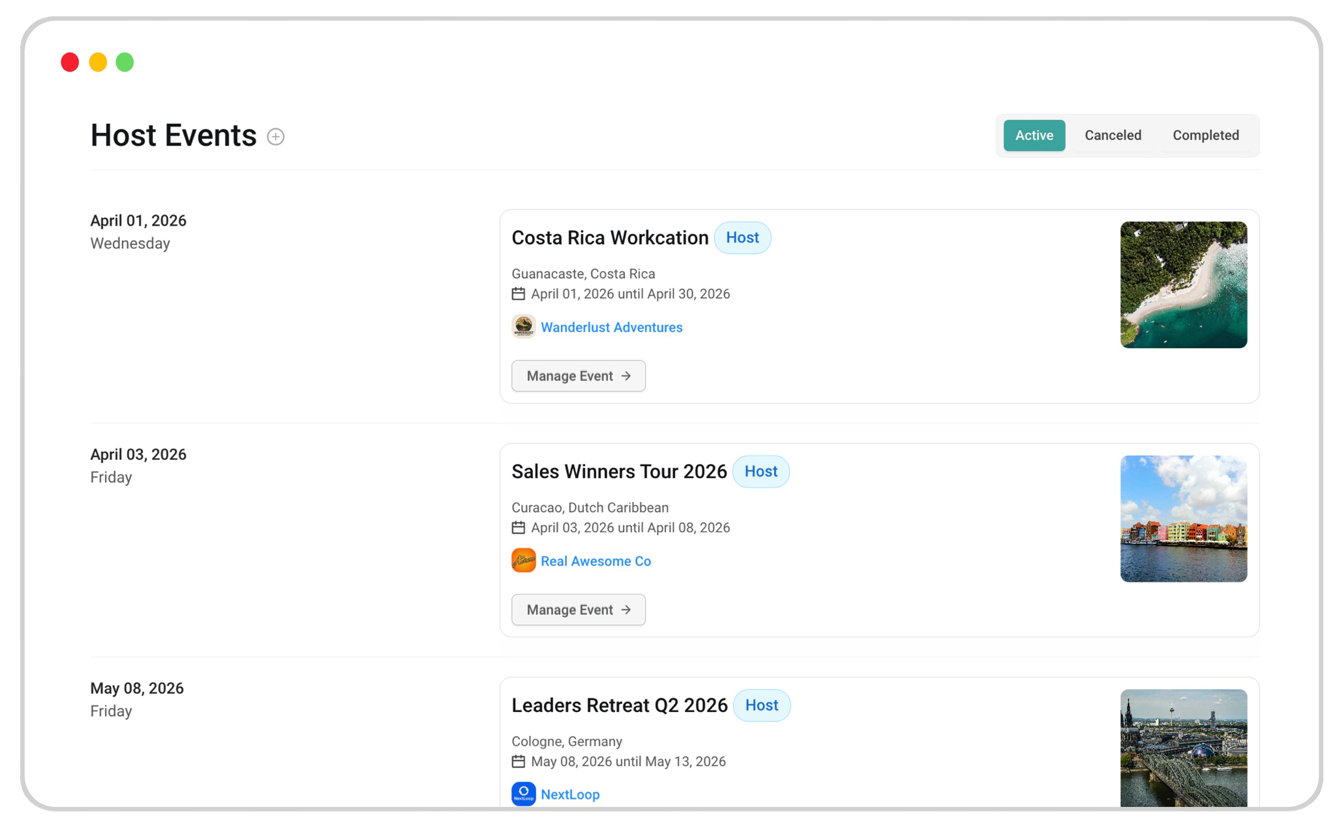 View all upcoming events in one high level dashboard, then dive into each one to manage the details.
