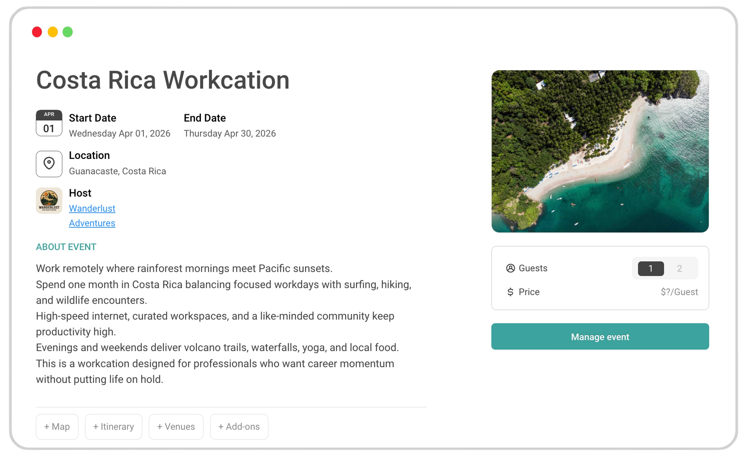 A good-looking landing page with a shareable link is just a few clicks away. Start with the basics and enrich with an itinerary, venues and other information as you go.